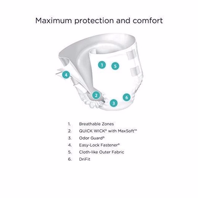 Designed for maximum leakage protection, Prevail Per-Fit features Comfort-Shape Plus with Easy-Lock Fastener Strips that shape to your body for a more comfortable and discreet fit than standard adult diapers. The cloth-like outer cover is soft and comfortable for all-day wear while ventilated waist panels allow air to pass through, reducing heat buildup and promoting healthy skin. Each product is constructed with a discreet core technology that allows for thinner, highly-absorbent material that enables the user to move more freely and confidently. Combined with a super absorbent polymer for dual protection, Odor Guard technology is proven to reduce the total amount of odor-causing ammonia formed during and after use. Moisture is quickly locked in upon contact for added leakage protection while the soft outer fabric provides additional all-day comfort. Each Prevail incontinence product features a proprietary Quick Wick layer of material with MaxSoft Technology that provides advanced softness with rapid liquid absorption for optimal product performance.